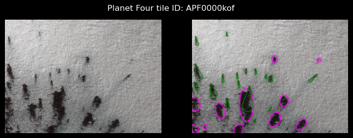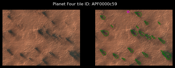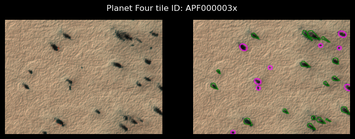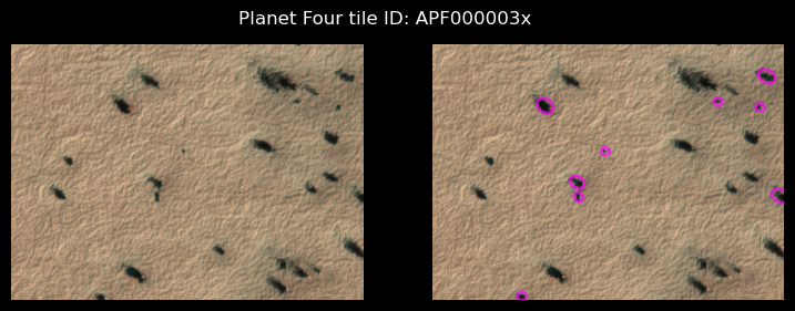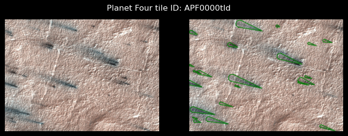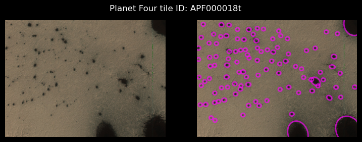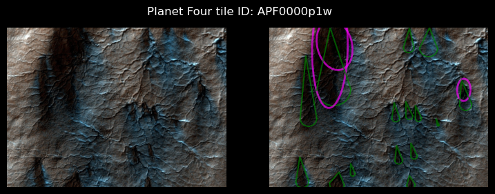 Plot the HiRISE tile without and with the fans for a given tile_id: