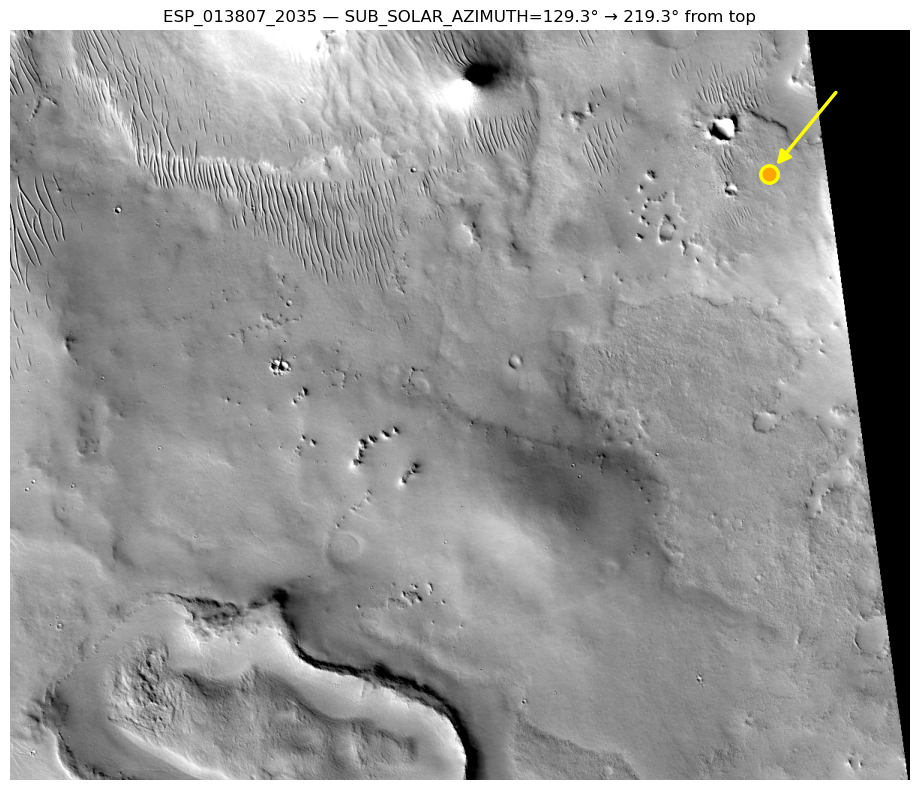 print("\nShadows should point AWAY from the sun indicator.")HiRISE SUB_SOLAR_AZIMUTH: 129.3° (CW from right)