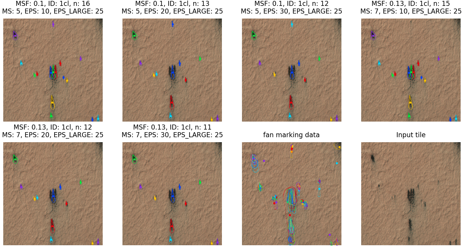 Clockwise from upper left: 1) Raw, 2) Fan markings, 3) Blotch markings, 4) Blotch reduction, 5) Fan reduction, 6) catalog entry with 50% majority vote